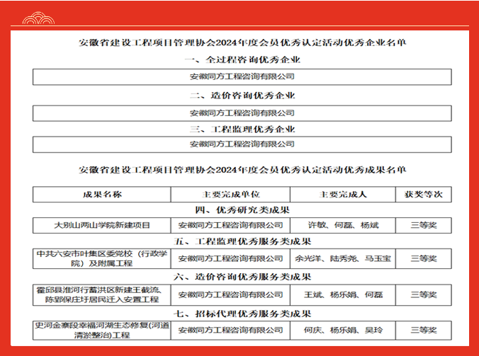 喜报!热烈祝贺公司及个人荣获安徽省建设工程项目管理协会2024年度各项荣誉,勇于争先,再创佳绩!